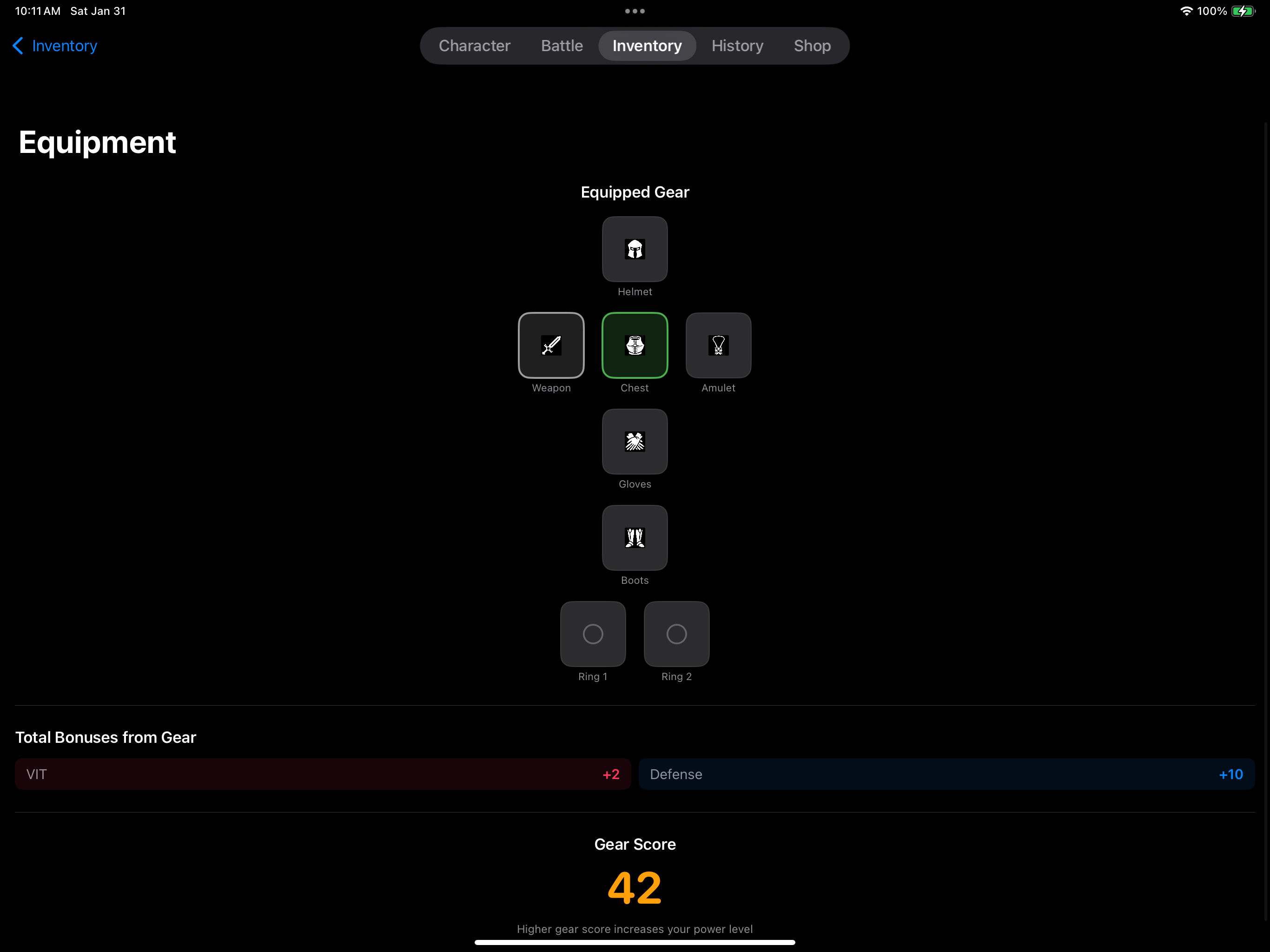- Equip gear to boost your stats and power score